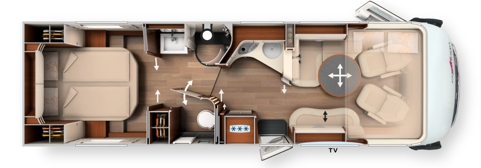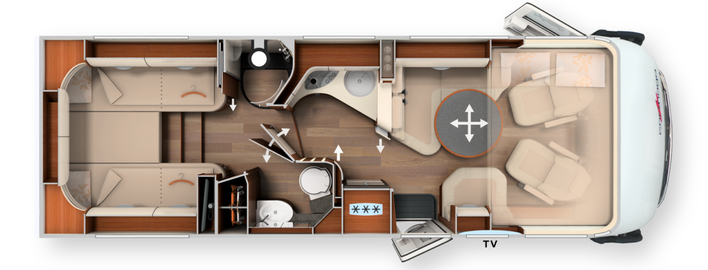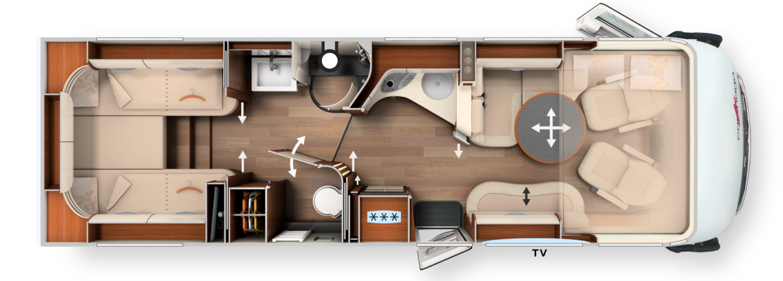 Im Inneren überzeugt der vollintegrierte chic s-plus mit der exklusiven Möbelarchitektur „emotionale“ und einem Two-level Raumkonzept. Die große Rundsitzgruppe mit Luxus-Wohnraumtisch sowie die Komfort-Winkelküche mit ausziehbarem Küchentresen runden das Interieur perfekt ab. Im Komfort-Raumbad inkl. komplett separierbarem Umkleidezimmer, mit viel Platz und Privatsphäre, können Sie sich ungestört frisch machen. Der Doppelboden-Keller bietet einen riesigen, beheizten Stauraum, welcher bequem von außen und innen zugänglich ist.